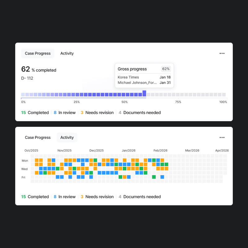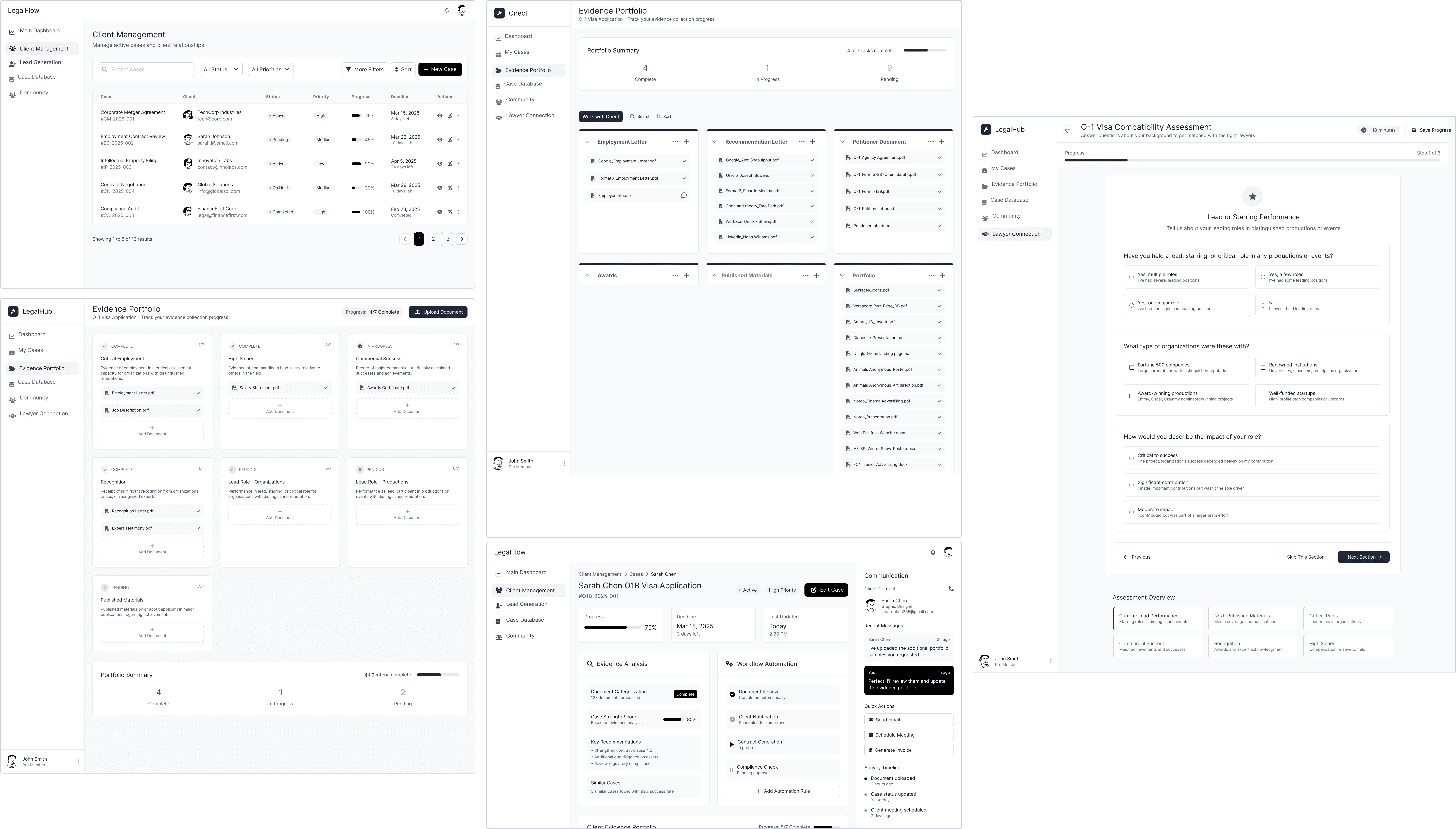 Onect AI is a role-based platform where applicants and attorneys share a data layer but never share a view. The applicant experience is built around clarity and momentum. The attorney experience is built around efficiency without disruption.