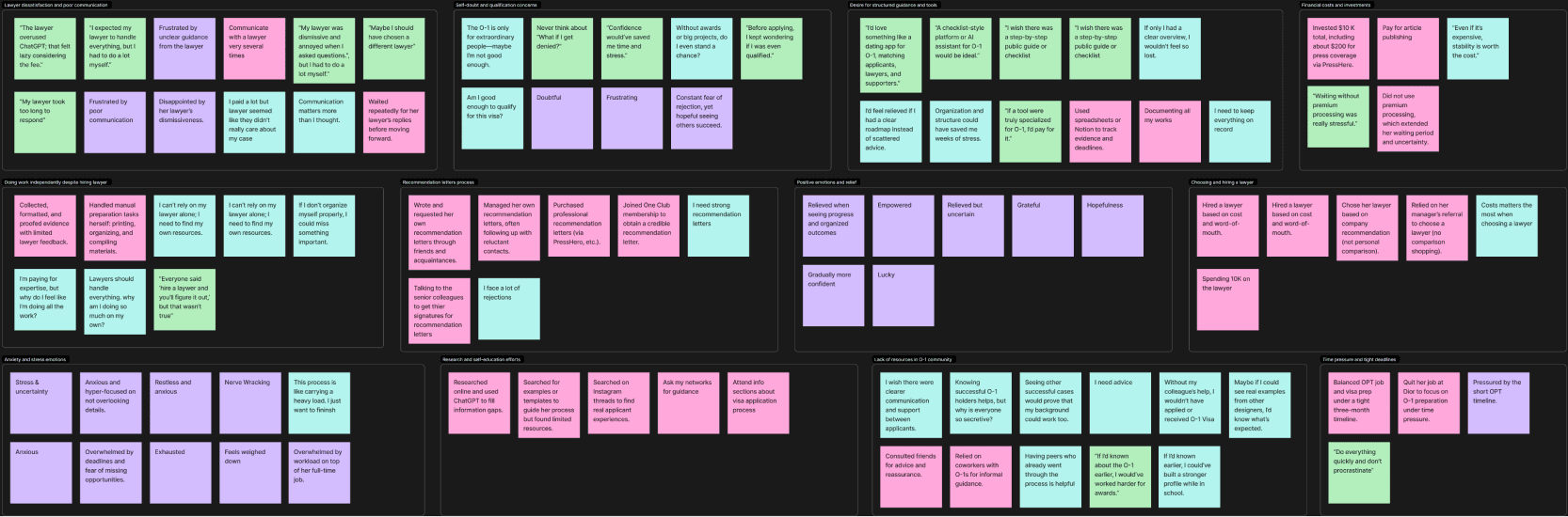 We spoke with 4 applicants who had recently received their O-1 visa and 3 immigration attorneys specializing in O-1 cases. Findings were synthesized via empathy mapping, then reframed using Jobs-to-be-Done to separate surface complaints from root causes.