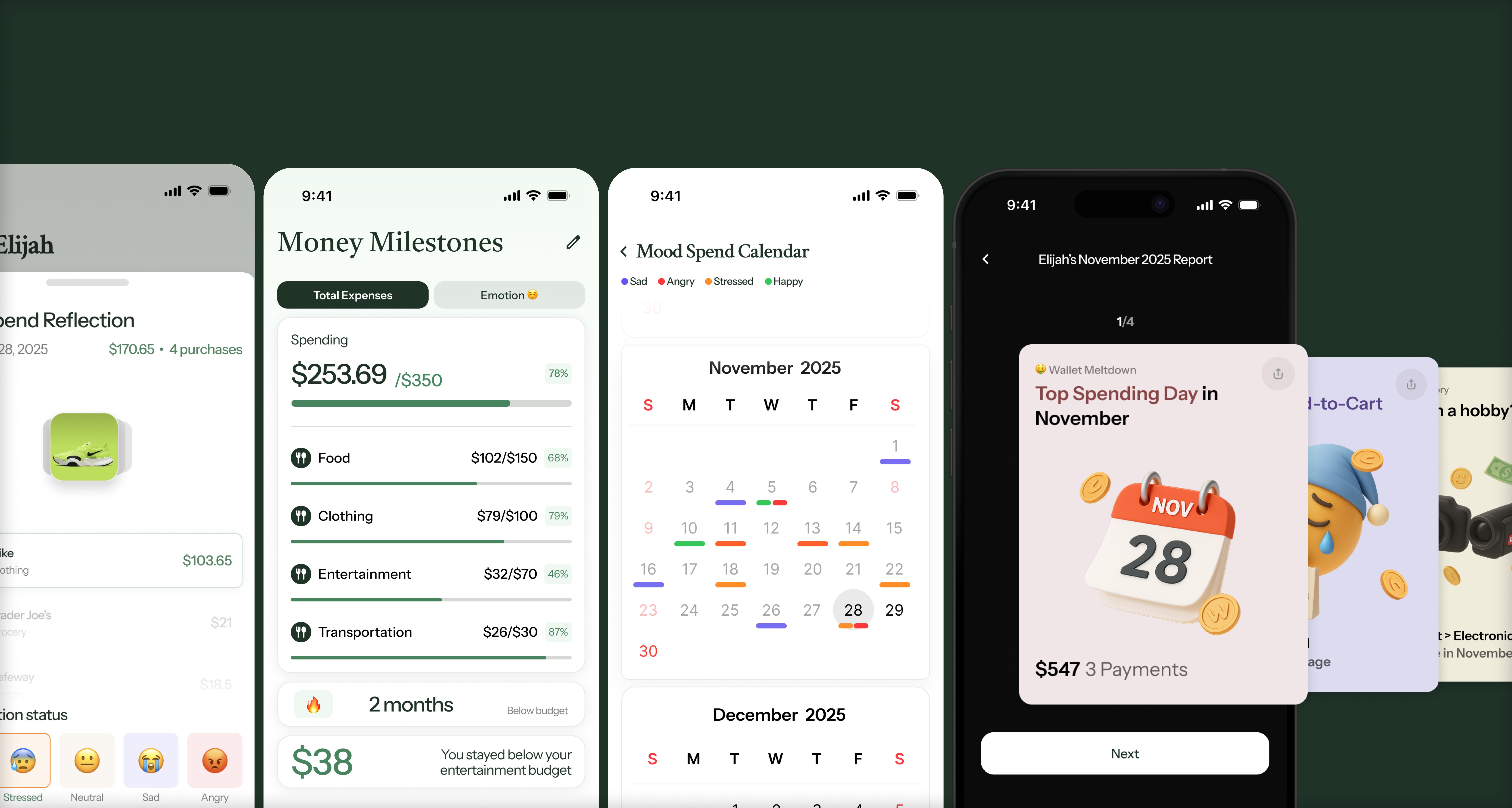 Today’s tools make money visible but emotion invisible: they track budgets, categories, and goals, but ignore why people spend in the first place. There is no mainstream product that connects emotional state, context, and spending in real time to offer compassionate, just-in-time nudges.